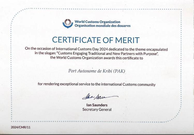 On January 26, 2024, during the 71st International Customs Day, the Port Authority of Kribi (PAK) received an International Certificate of Merit from the World Customs Organization (WCO).